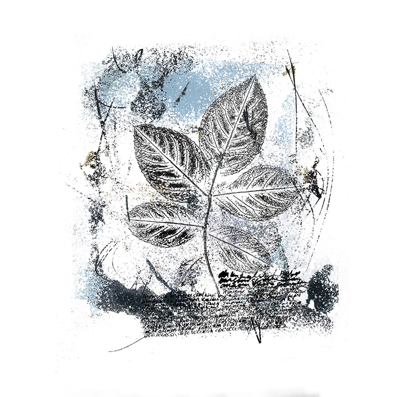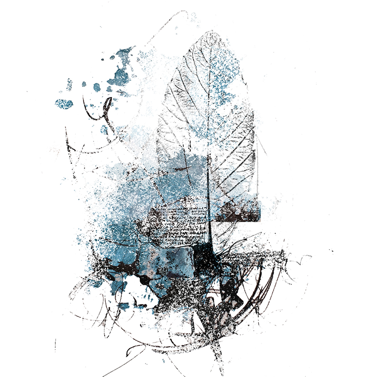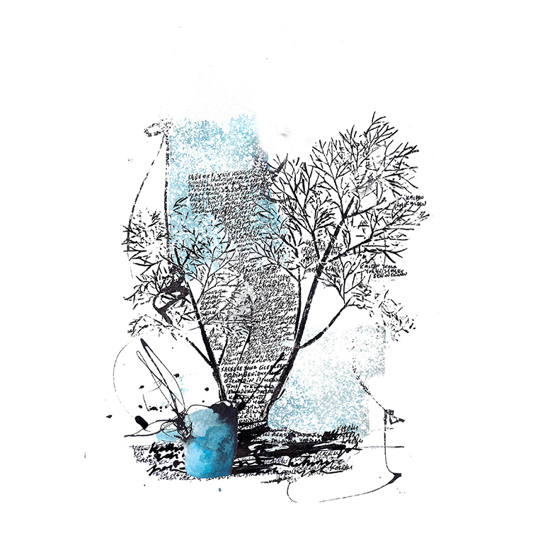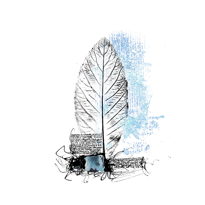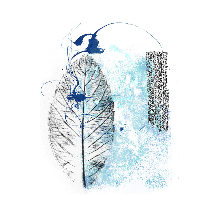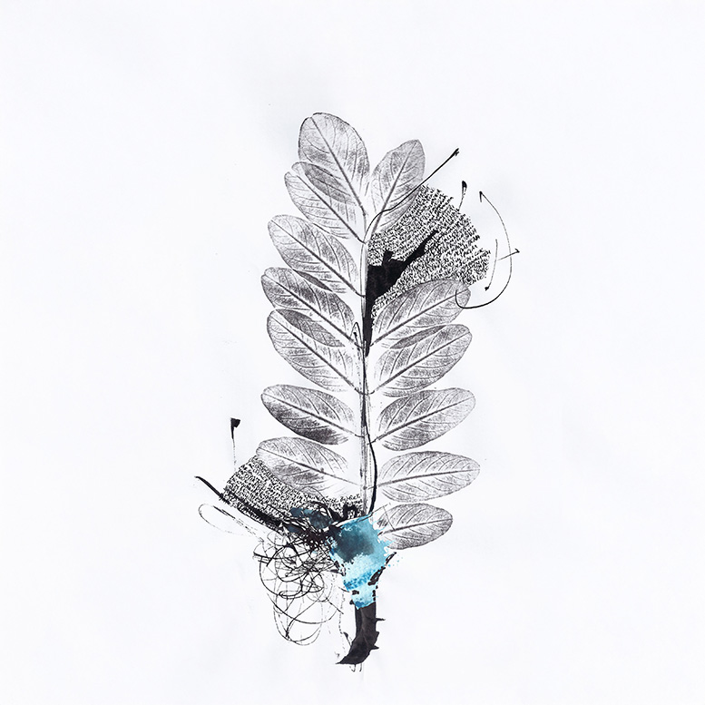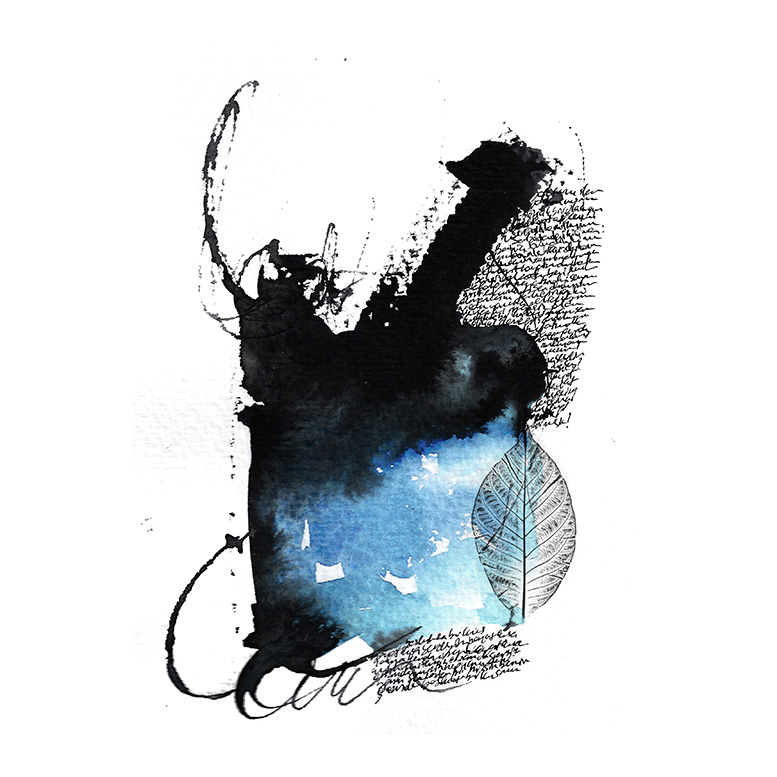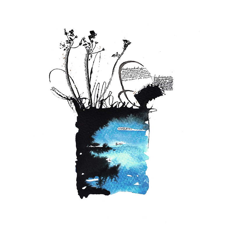 Suluboya, monoprint ve lavi gibi tekniklerle başlayan üretim sürecim, zamanla karışık tekniklerin de dahil olmasıyla evrim geçirdi. Eserlerde sıkça yer verdiğim bitki formları, Sarıcakaya’da bana iyi gelen, dinginlik ve huzur anları yaşatan doğadan izler taşıyor. Mavinin soluk ve iç içe geçmiş katmanlarında gözyaşlarının izlerini, siyah mürekkep ve soyut lekeler, artık kelimelerin konuşmadığı fakat duyguların yoğunlaştığı bir anlatı dili kuruyor. El yazımın bilinçli olarak okunmaz kılınması, bu hikâyelerin izleyiciye değil, bana ait olduğunu ama sezgisel bir temas kurma ihtimalini açık bıraktığımı simgeliyor. Çünkü her hikâye okunmak zorunda değildir; bazıları yalnızca hissedilir.