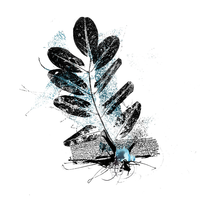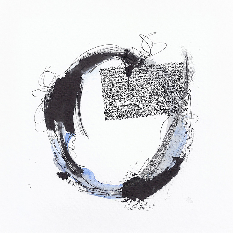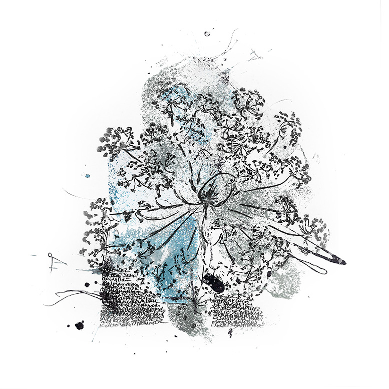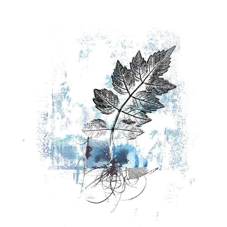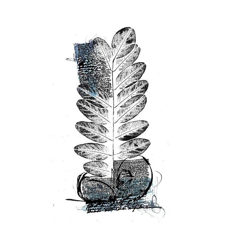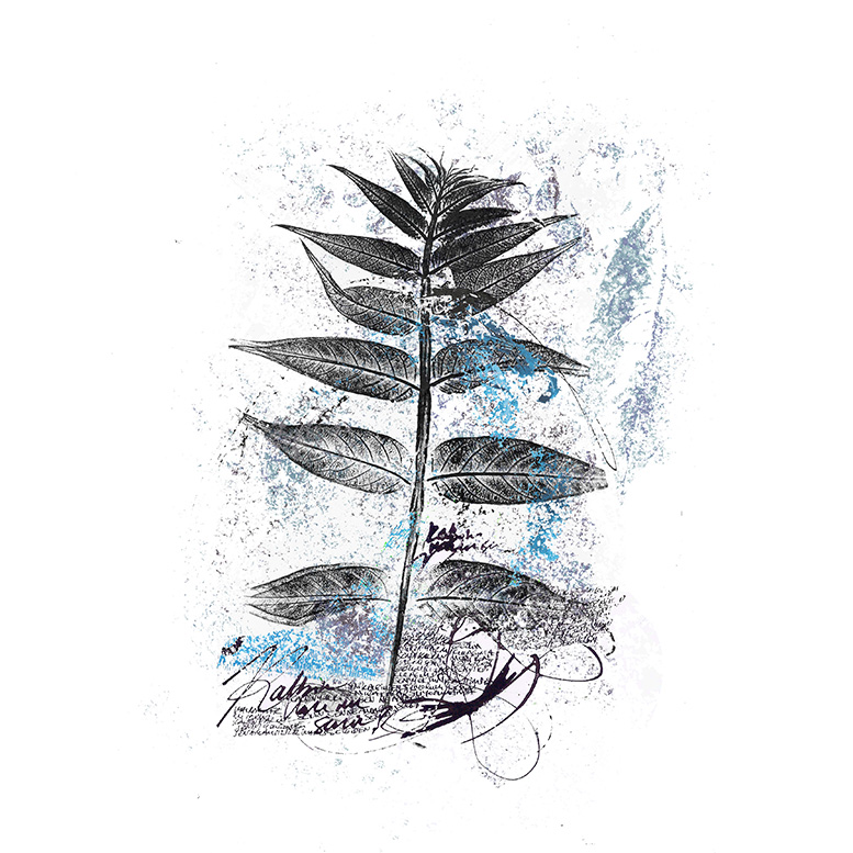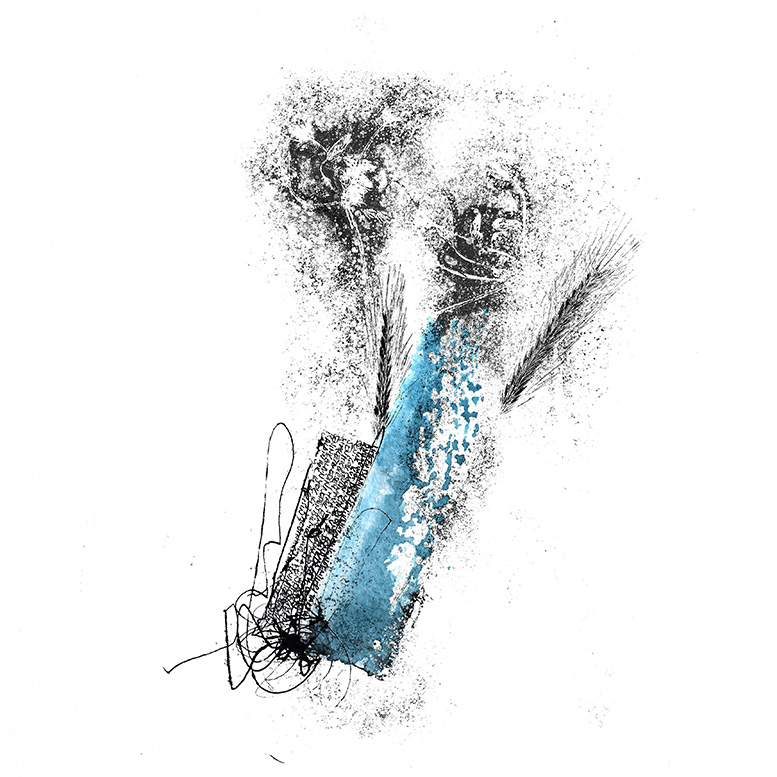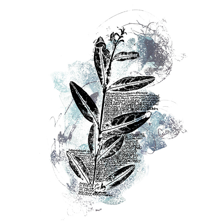 Suluboya, monoprint ve lavi gibi tekniklerle başlayan üretim sürecim, zamanla karışık tekniklerin de dahil olmasıyla evrim geçirdi. Eserlerde sıkça yer verdiğim bitki formları, Sarıcakaya’da bana iyi gelen, dinginlik ve huzur anları yaşatan doğadan izler taşıyor. Mavinin soluk ve iç içe geçmiş katmanlarında gözyaşlarının izlerini, siyah mürekkep ve soyut lekeler, artık kelimelerin konuşmadığı fakat duyguların yoğunlaştığı bir anlatı dili kuruyor. El yazımın bilinçli olarak okunmaz kılınması, bu hikâyelerin izleyiciye değil, bana ait olduğunu ama sezgisel bir temas kurma ihtimalini açık bıraktığımı simgeliyor. Çünkü her hikâye okunmak zorunda değildir; bazıları yalnızca hissedilir.